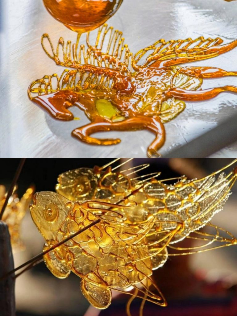 在长春市,最常见的“糖画”是平面糖画。除了平面画,手艺好的艺人还会在石板上将平面“零件”拼接出风格各异的立体画来,像极一件装饰品,令人不忍吃掉。若要做一个花篮,先用糖稀做个圆糖饼,再接着倒一个小一点的圆圈,利用两次糖稀的冷热不同,一提,立体的花篮筐底就出来了。再加提梁、花卉等,整个花篮不再是平面的糖画,而是立体的、生动的、丰富多彩的。
